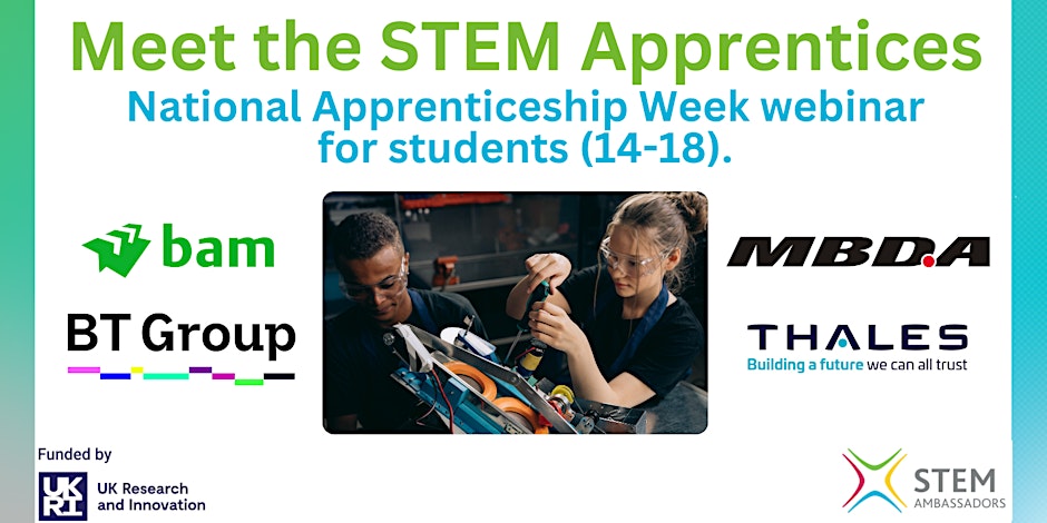 Meet the Apprentices | Thurs 12th Feb 4:00-:430pm | Students aged 14-18 Hear from apprentices at MBDA, BAM Nuttall, BT and Thales UK on why they chose the apprenticeship pathway, what their week looks like, and...
